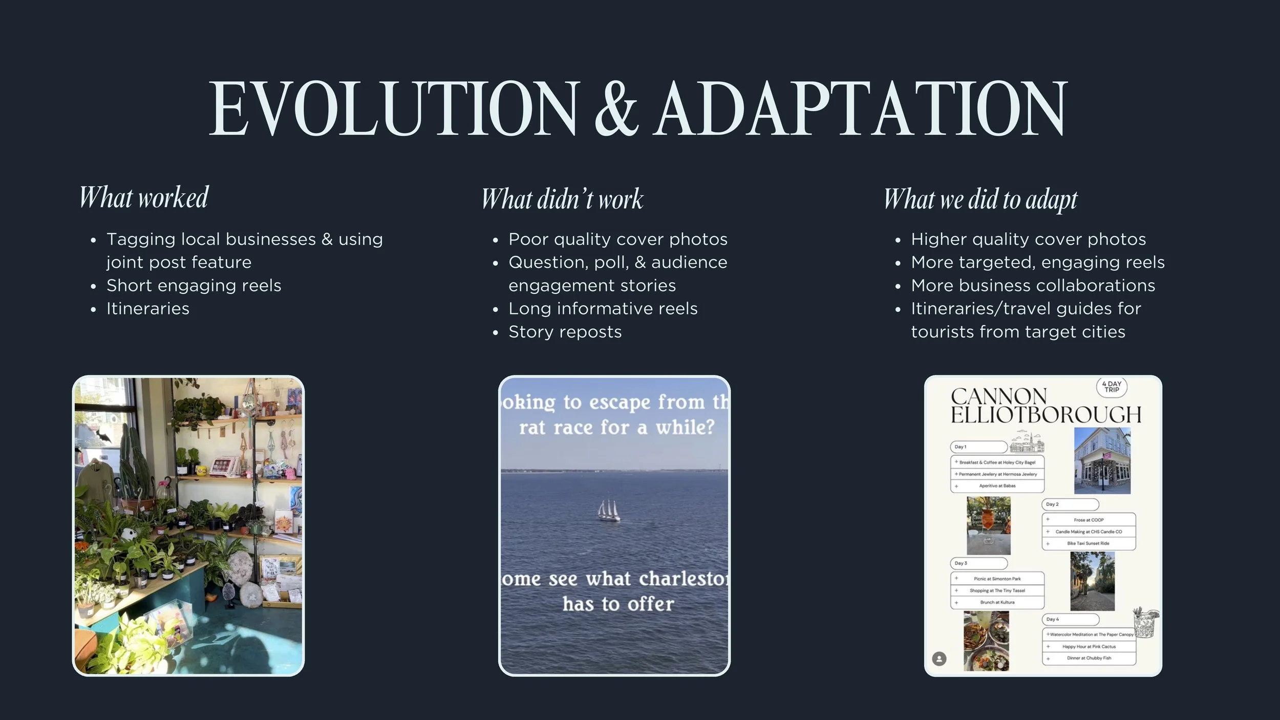 I partnered with Explore Charleston through the College of Charleston, serving as a digital content creator who designed and executed a six-week Instagram campaign capturing the charm of the Cannonborough-Elliotborough neighborhood and expanding its visibility among travelers and weekend visitors.
